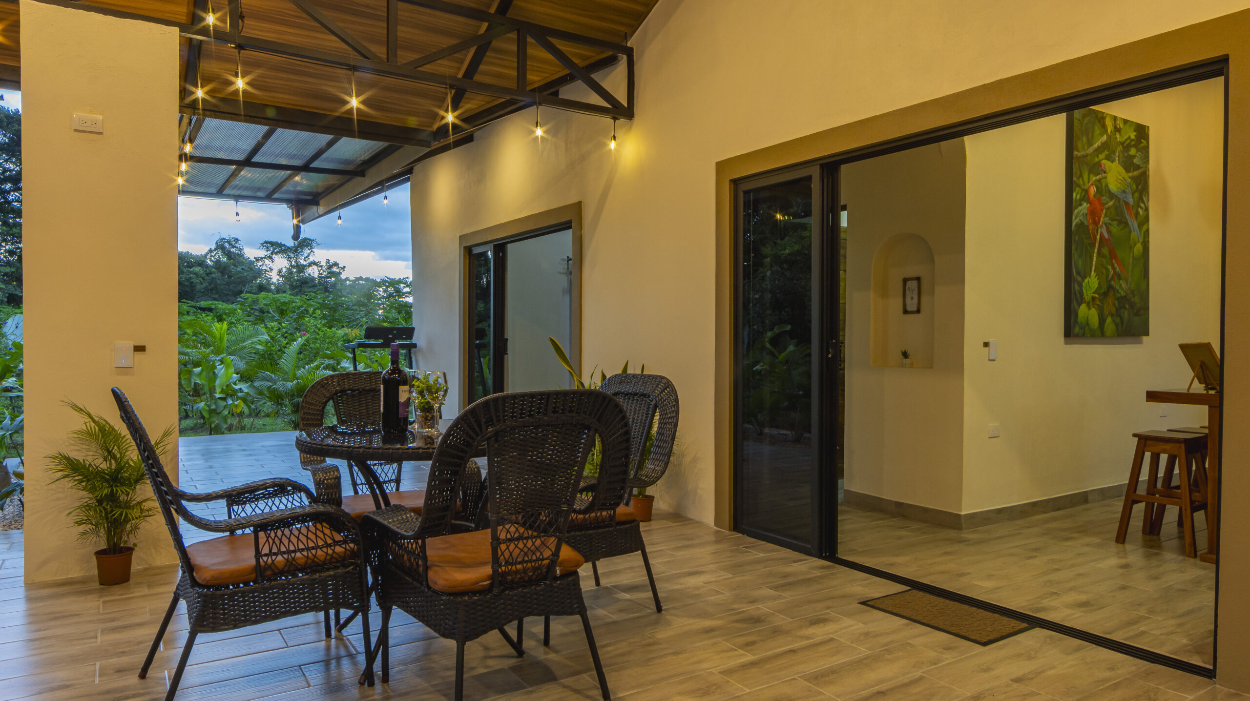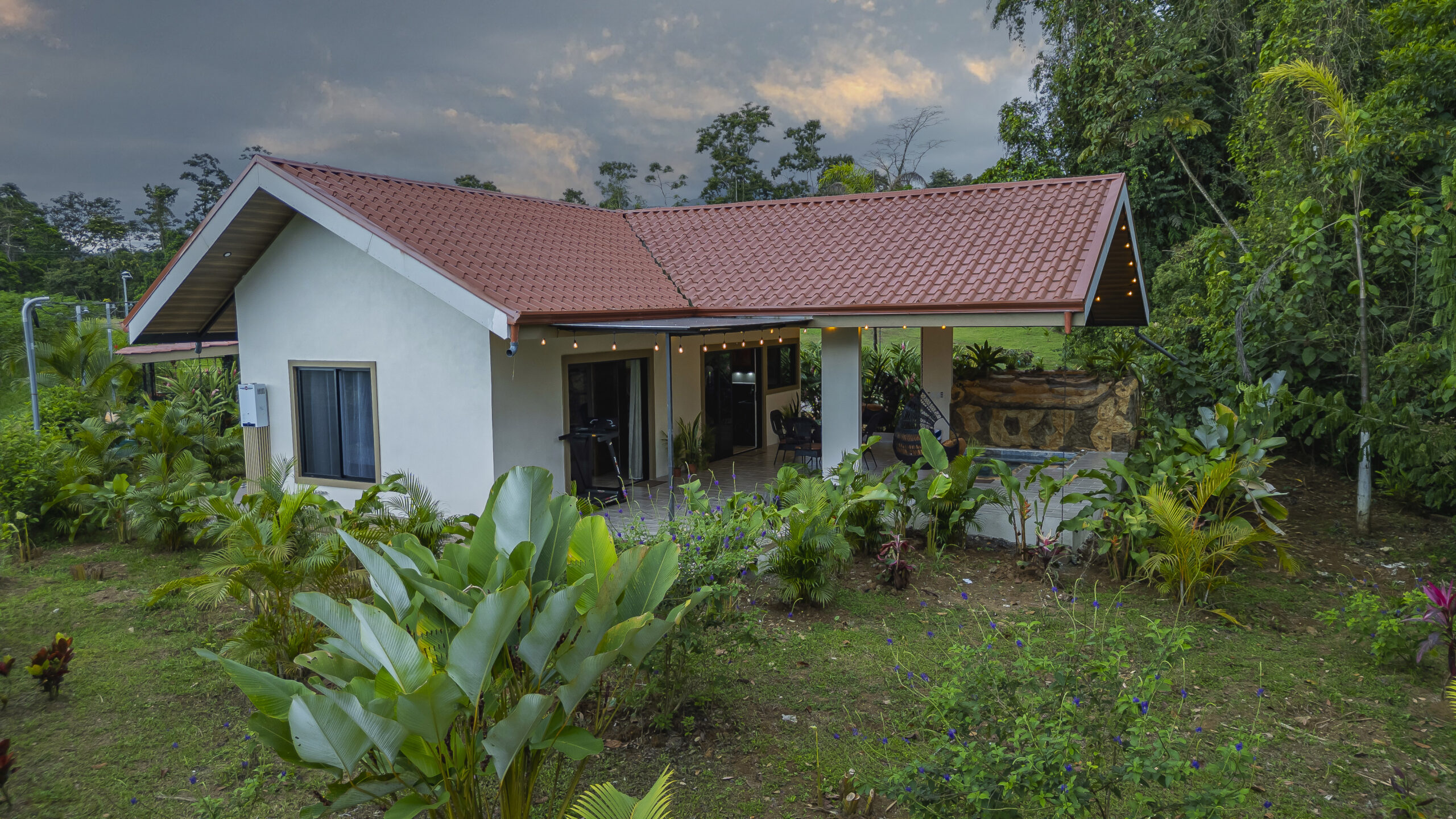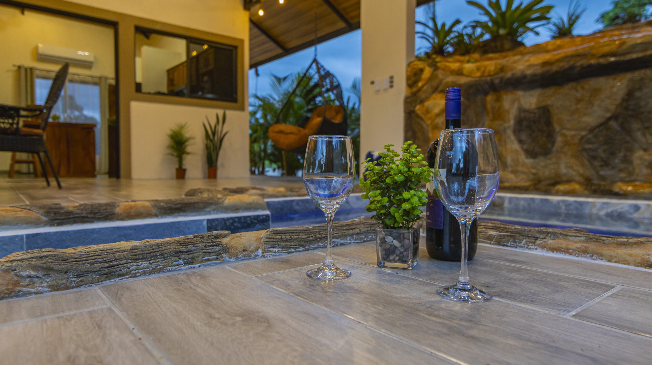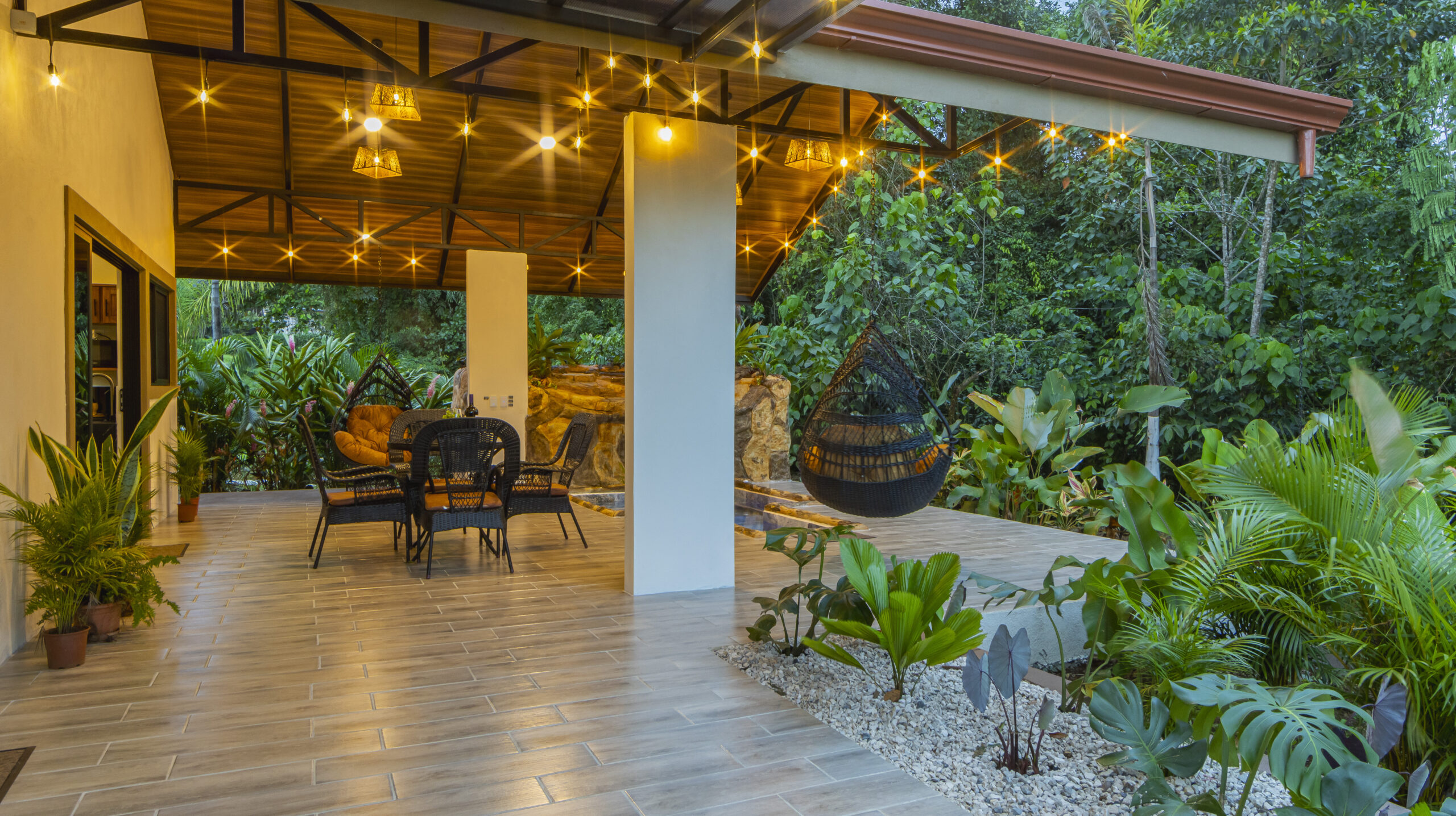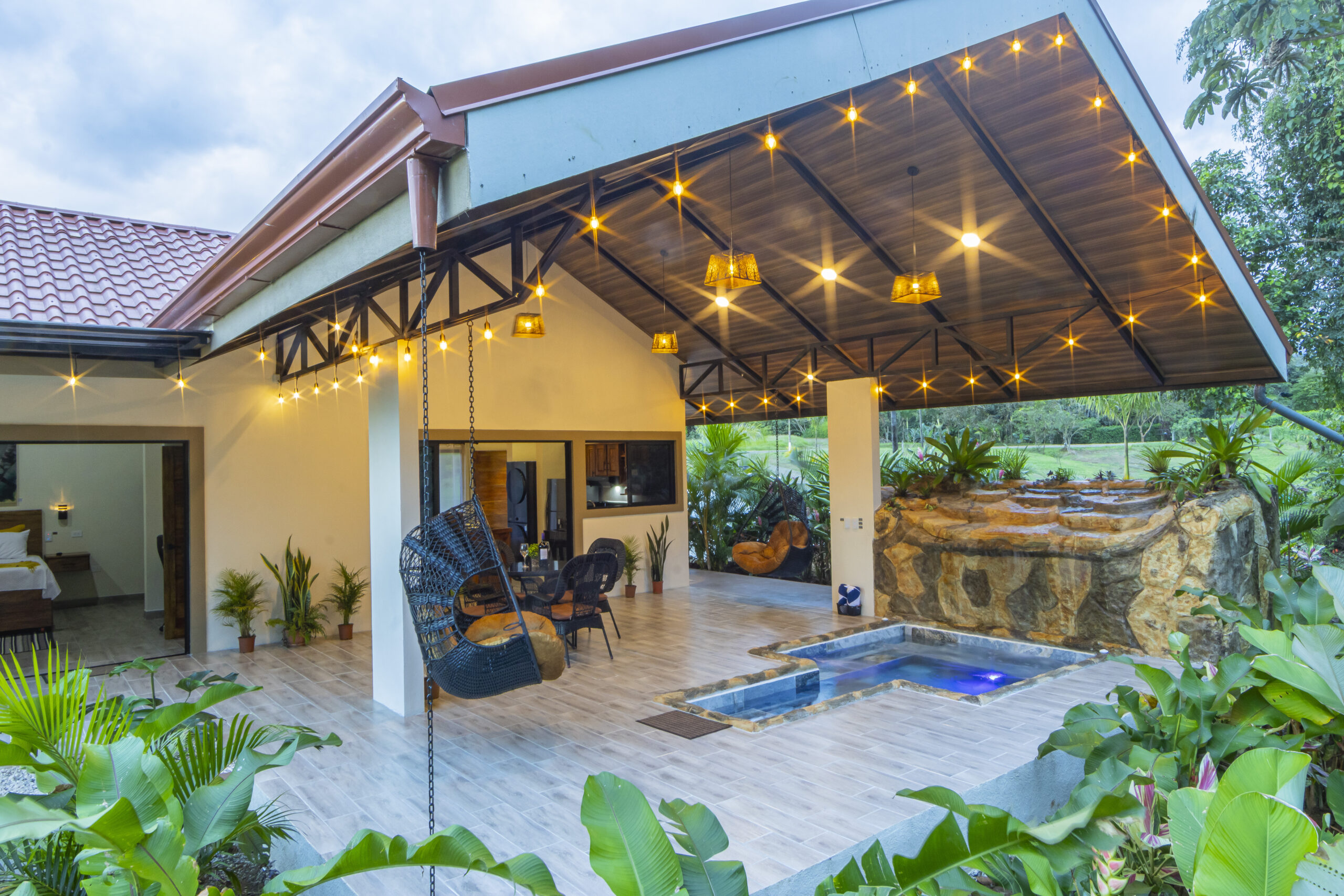 At Villas Evergreen, your private jacuzzi is more than a place to relax — it’s an experience. Framed by a stunning open-air terrace with warm hanging lights and lush tropical gardens, the stone-surrounded jacuzzi with its natural waterfall feature glows beautifully at dusk. The terrace opens up to sweeping green views of the surrounding landscape, so you can soak while nature stretches out before you. A cozy hanging chair, outdoor dining area, and direct access to the bedroom make this space perfect for unwinding at any hour.